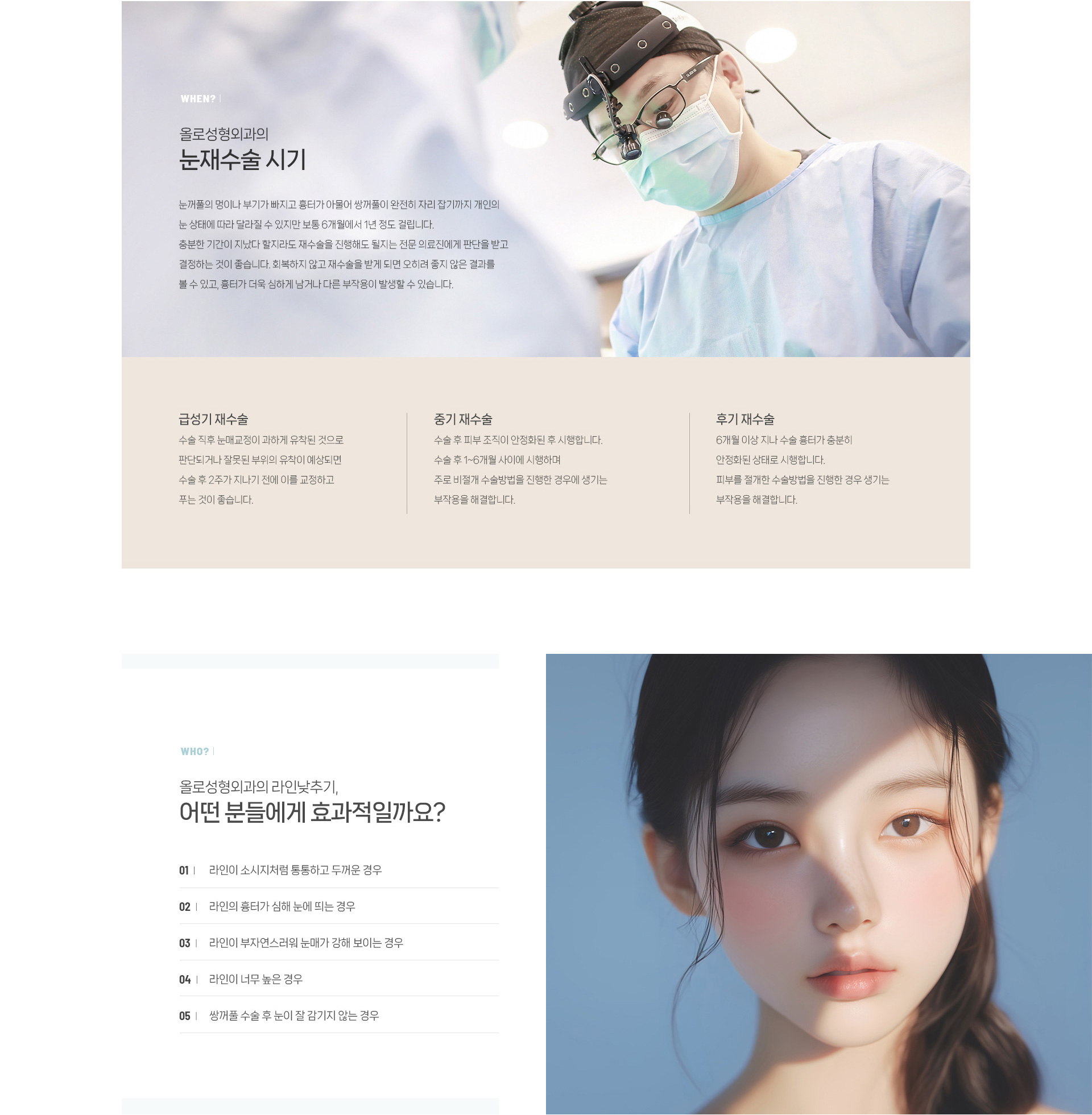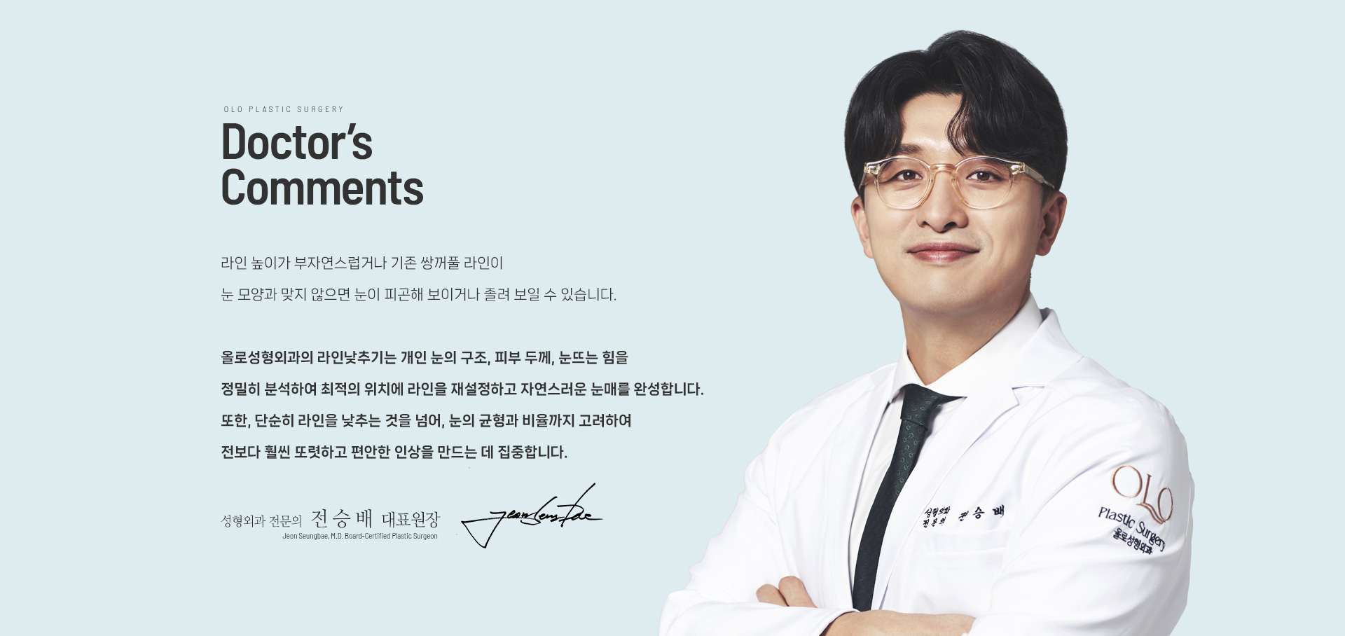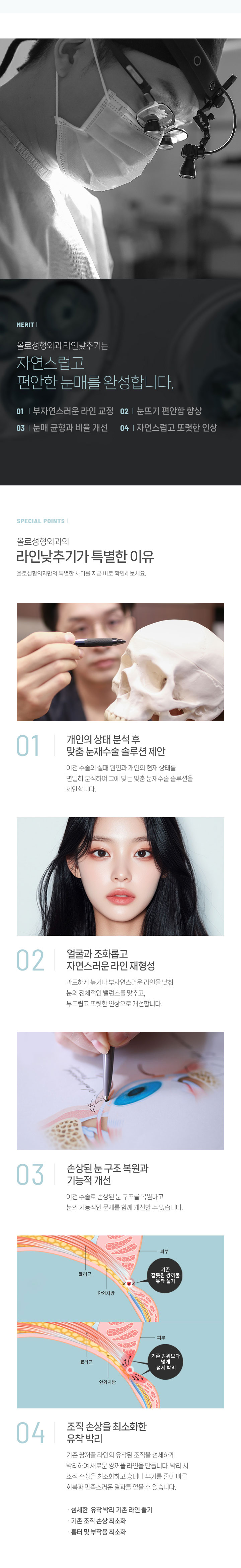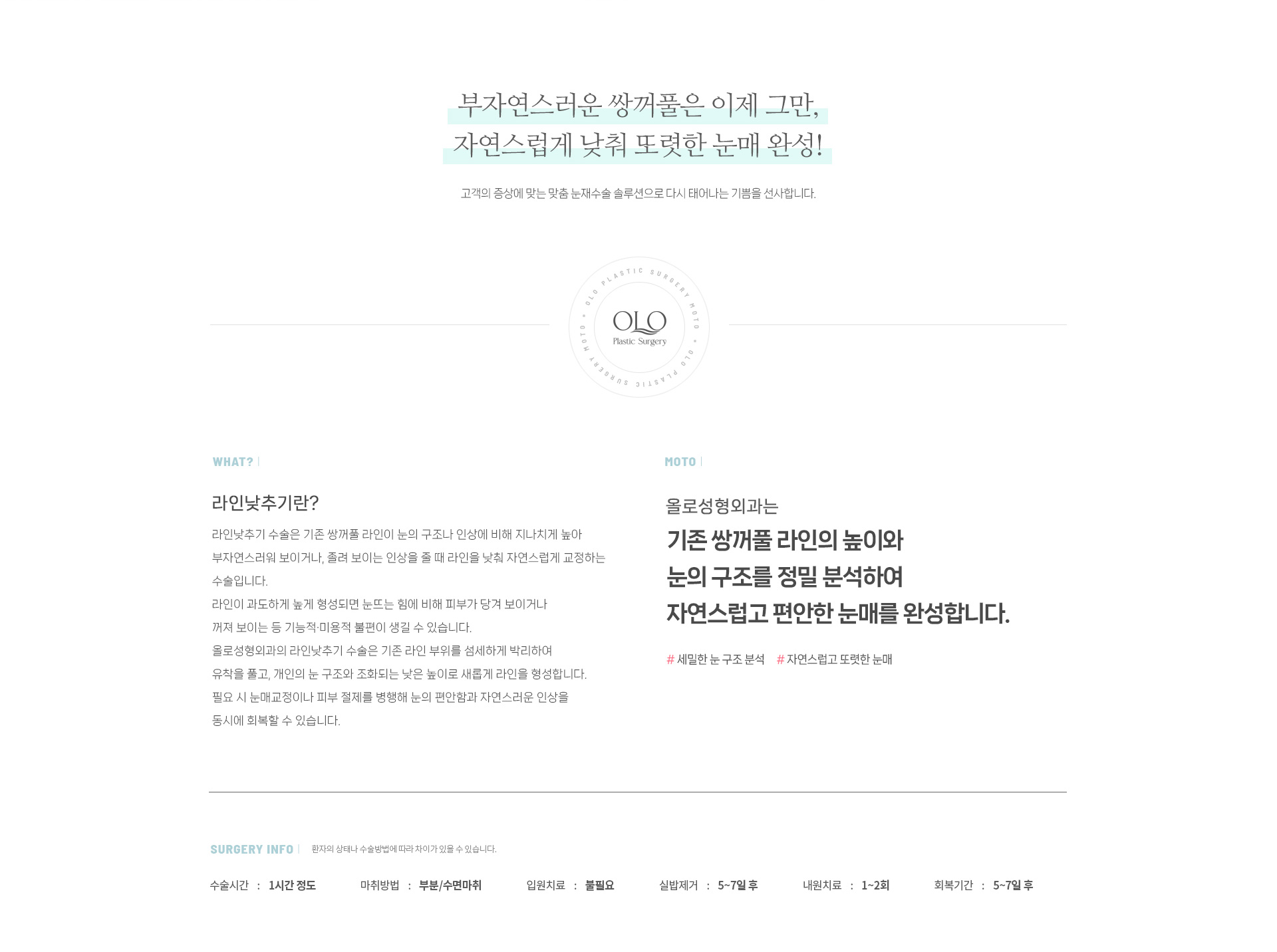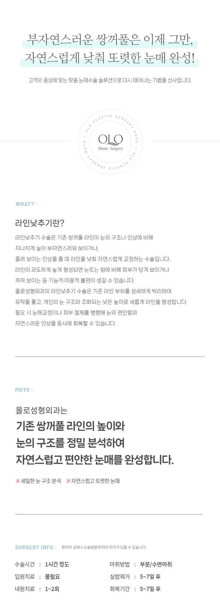 올로는 재유착 방지와 흉터 최소화를 위한 섬세한 수술법으로 회복이 빠르고, 눈을 떴을 때 거의 눈에 띄지 않는 결과를 목표로 합니다.