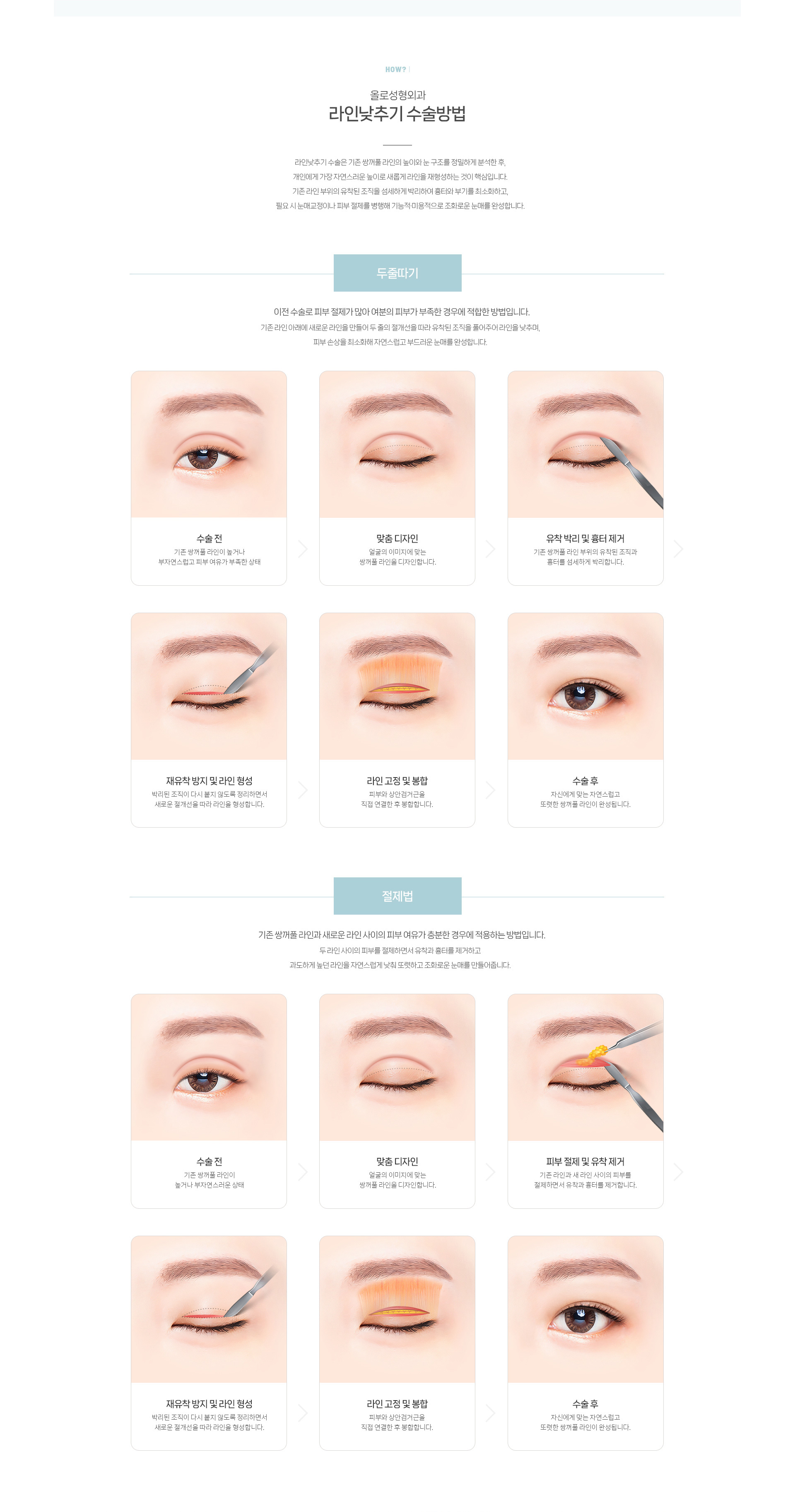 피부 여분이 적고 절개가 많이 되어 있는 경우에는 두줄따기로 조직을 최대한 보존하면서 라인을 낮추는 것이 효과적이고,
