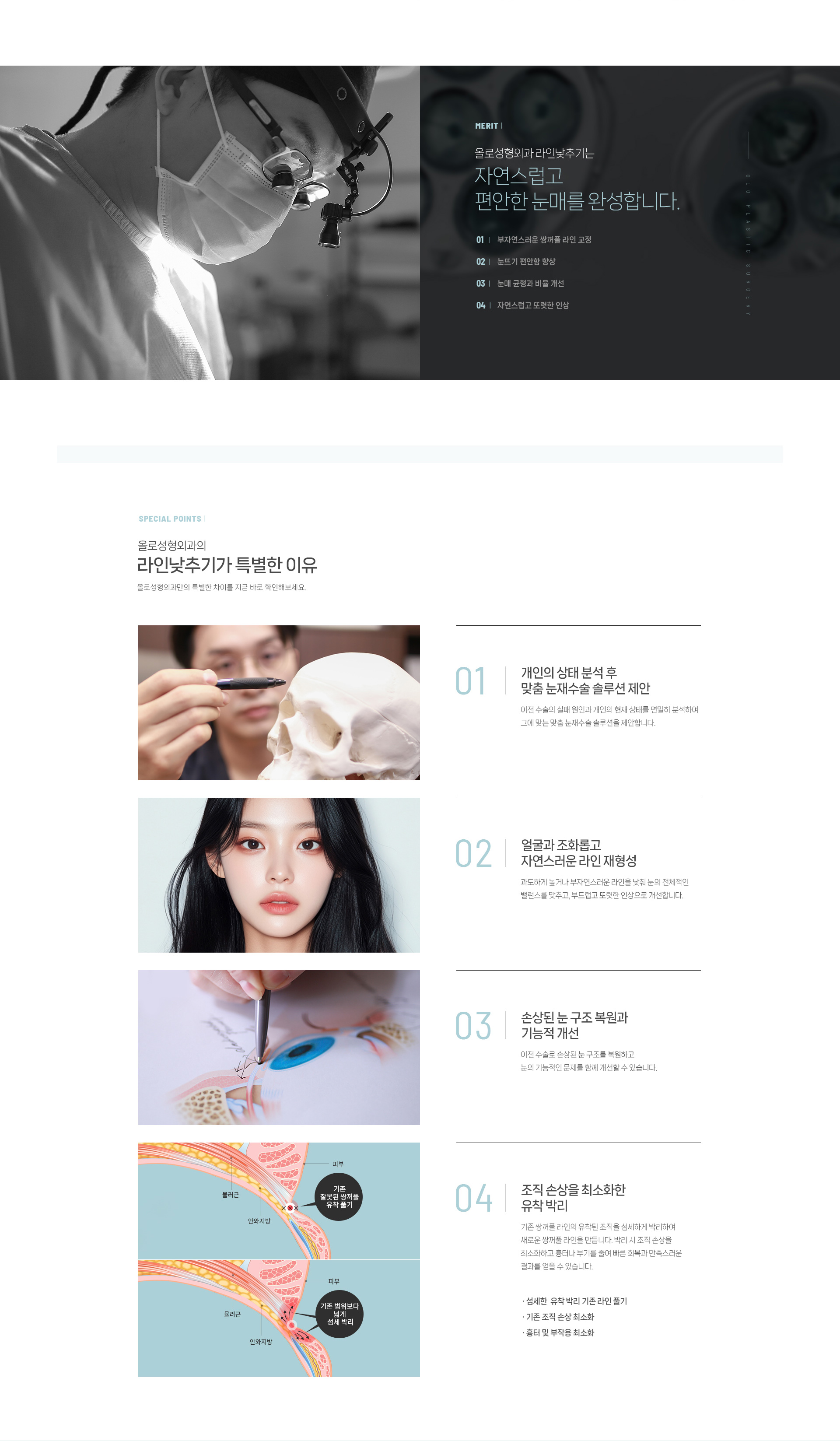눈매교정이나 앞·뒤트임을 함께 진행하면 라인을 낮추면서도 눈의 길이와 또렷함을 보완할 수 있어, 전체적인 밸런스 개선 효과가 높습니다.