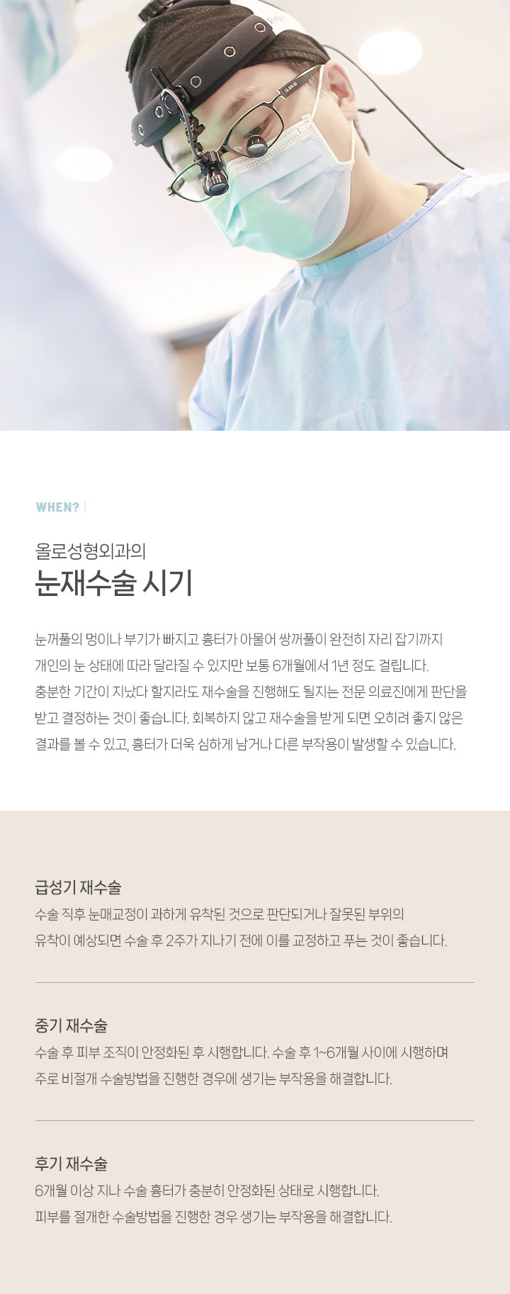 일반적으로 눈재수술은 최소 6개월에서 1년 정도 기다린 후 흉터가 충분히 안정화된 상태에서 진행하는 것이 안전합니다.